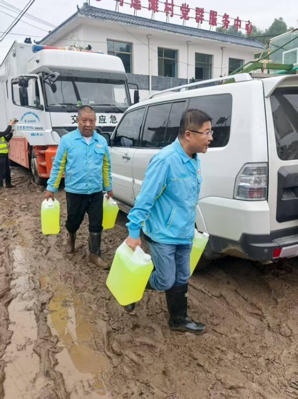 由于部分道路被冲毁,车辆通行困难,工作人员克服重重阻碍,在油罐车无法继续前行的情况下,将油装进油桶,手提肩扛分批送入灾区。次日凌晨3时左右,历时7个小时,队员们将第一批油品成功送到了救援现场,立即为抢险救援车辆、机械和发电机等设备加注燃油,争分夺秒助力打通抢险救灾生命线。
