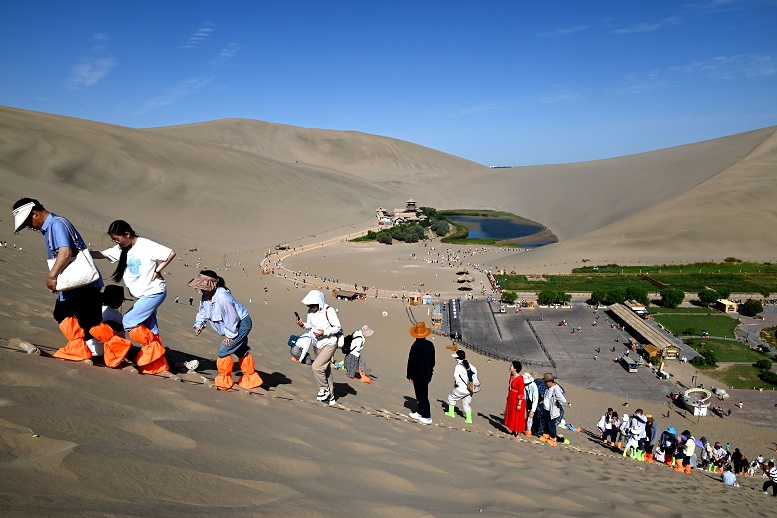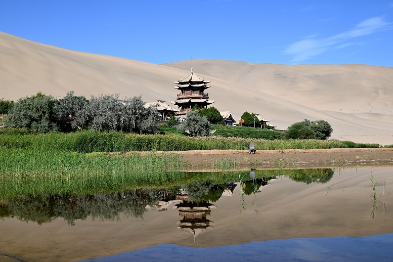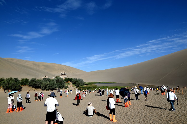 初秋时节,甘肃省敦煌市鸣沙山月牙泉景区风光迷人、景色如画。
