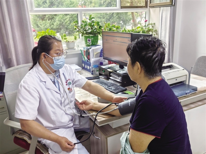 肃州区西南街社区卫生服务中心医生为患者测量血压。