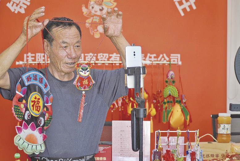 正宁县山河镇董庄村主播张富平直播销售香包。 (资料图)