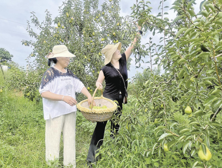 游客在梨园采摘香蕉梨。 通讯员 程娟娟 摄