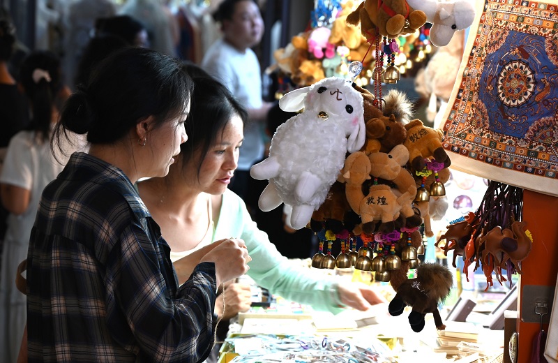 游客在甘肃省敦煌夜市选购地方特色文创产品。