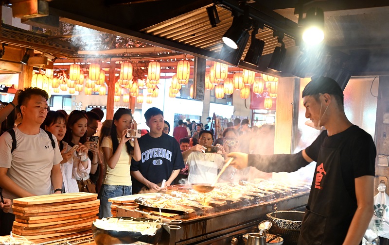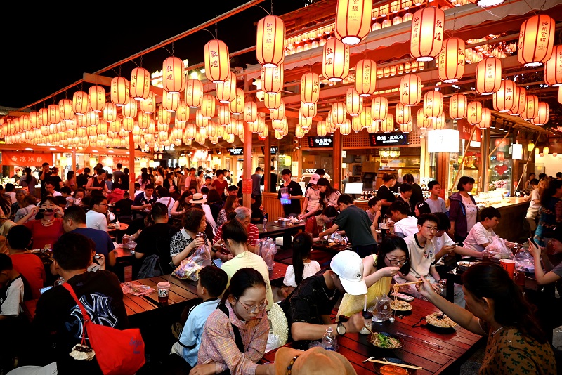 游客在甘肃省敦煌夜市沙州食驿选购品尝特色美食。
