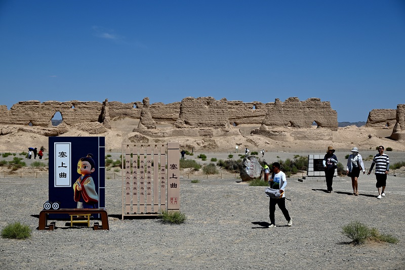游客在世界文化遗产甘肃省敦煌市玉门关景区大方盘城遗址游览。