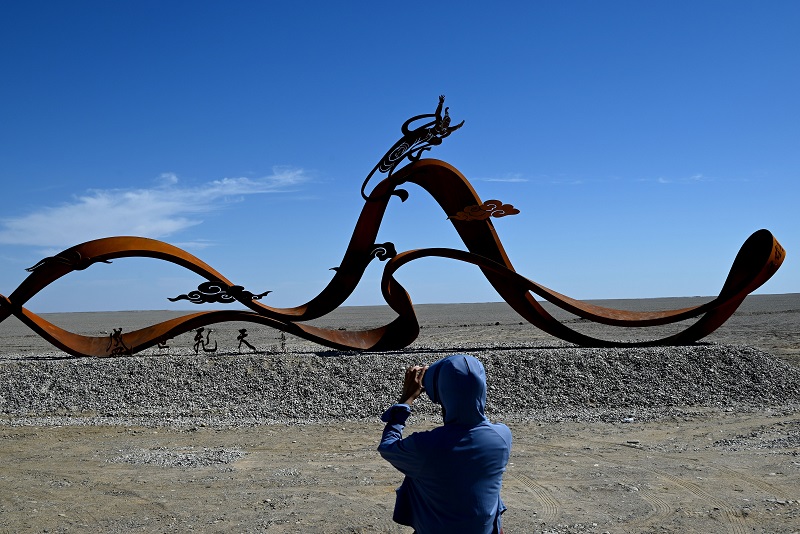 在甘肃敦煌阳关景区至玉门关景区的道路沿线,游客在今年7月建成的“盛世飞天”雕塑打卡点参观拍照。