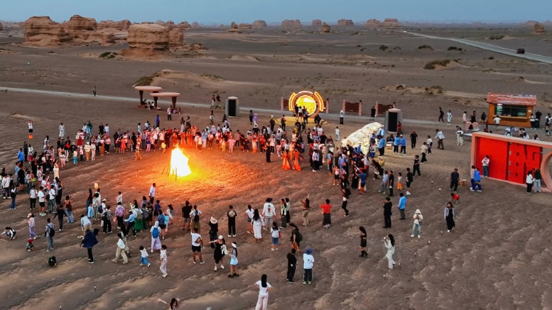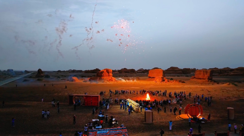 夜空中,烟花骤然绽放,璀璨光芒瞬间照亮整片雅丹。光影与地貌交相辉映,美得让人屏息,引得人群中爆发出阵阵欢呼,为这一夜添上了浓墨重彩的浪漫与惊喜。篝火旁,人们手牵着手跳起欢快的舞蹈,跳动的火焰驱散了夜的微凉,更悄悄拉近了彼此的距离,让陌生的旅人在此刻感受到家一般的温暖与融洽。