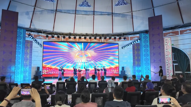 在风情园大毡房,博主大V们现场观看了哈萨克族歌舞表演,洁白毡顶下表演者们精彩的演出吸引台下博主大V们纷纷拿出手机取材留念。
