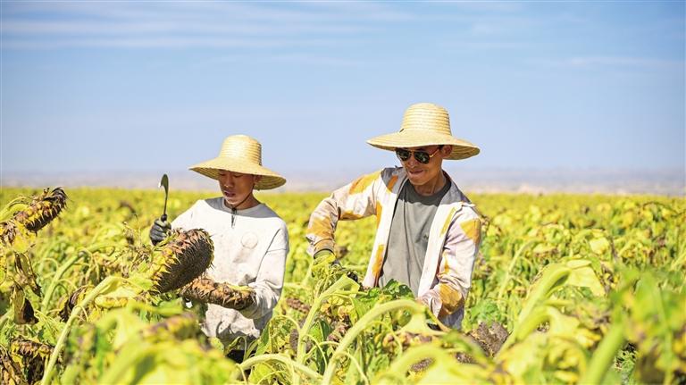 走进兰州新区重度盐碱耕地试验区,一派繁忙景象映入眼帘。几名农户熟练地收割着成熟的油葵,动作干净利落。“今年这油葵长得真好,多亏了盐碱耕地改良技术,这是技术突破带来的惊喜。”甘肃瑞盛水利水电工程有限公司项目负责人李德苍摘下沉甸甸的葵花盘,轻轻一搓,一颗颗饱满的籽粒便落下来。