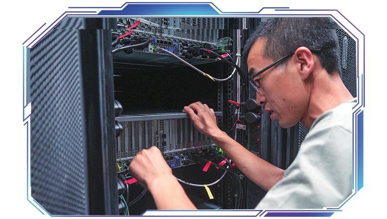 在中国移动(甘肃·庆阳)数据中心N01新型工业化数据中心机房里,技术人员在调试设备。冯喜斌