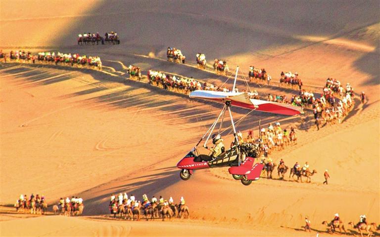 游客乘坐滑翔机俯瞰敦煌大漠风光。王斌银 周玉玲