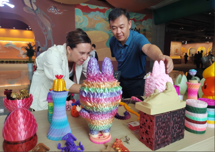在第八届丝绸之路(敦煌)国际文化博览会上,山丹县3D打印丝路文创产品惊艳亮相。产品以丝路元素为灵感,以3D打印为核心,将古老文明与现代科技巧妙融合,成为嘉宾和观众驻足关注的焦点。(董力玮)