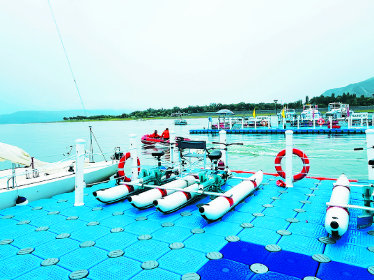 位于永靖县三塬镇的向阳码头是炳灵寺世界文化遗产旅游区(国家5A级)核心枢纽,依托炳灵湖(刘家峡水库)打造的帆船、桨板、皮划艇、水上自行车等各类水上项目,吸引游客前来体验游玩。 临夏融媒记者 周俊清 摄
