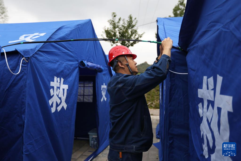9月27日,救援人员在陇西县文峰镇桦林村受灾安置点接电。新华社发(王克贤 摄)