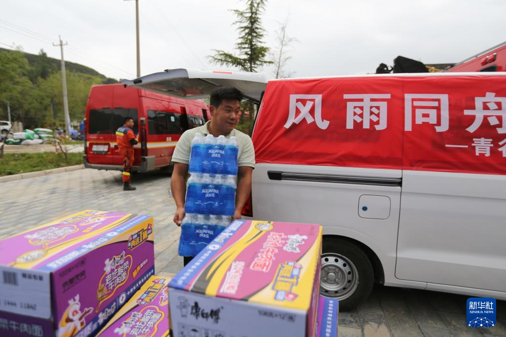 9月27日,在陇西县文峰镇桦林村受灾安置点,救援人员在搬运物资。新华社发(王克贤 摄)