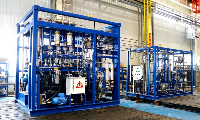 兰石集团氢能装备受到国际市场认可,2025年4月,与沙特AHG公司签订70MPa橇装加氢站项目,图为兰石装备公司自主研制的45MPa离子液氢气压缩机。