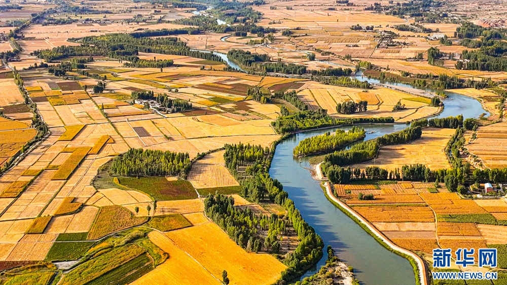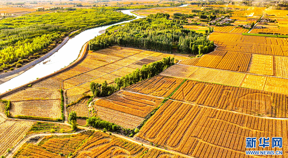 金秋时节,在甘肃省张掖市临泽县鸭暖镇段的黑河沿岸,蜿蜒河道两侧的大地铺金叠翠,尽显勃勃生机,构成了一幅金秋丰收的美丽画卷。新华网发(王将 摄)