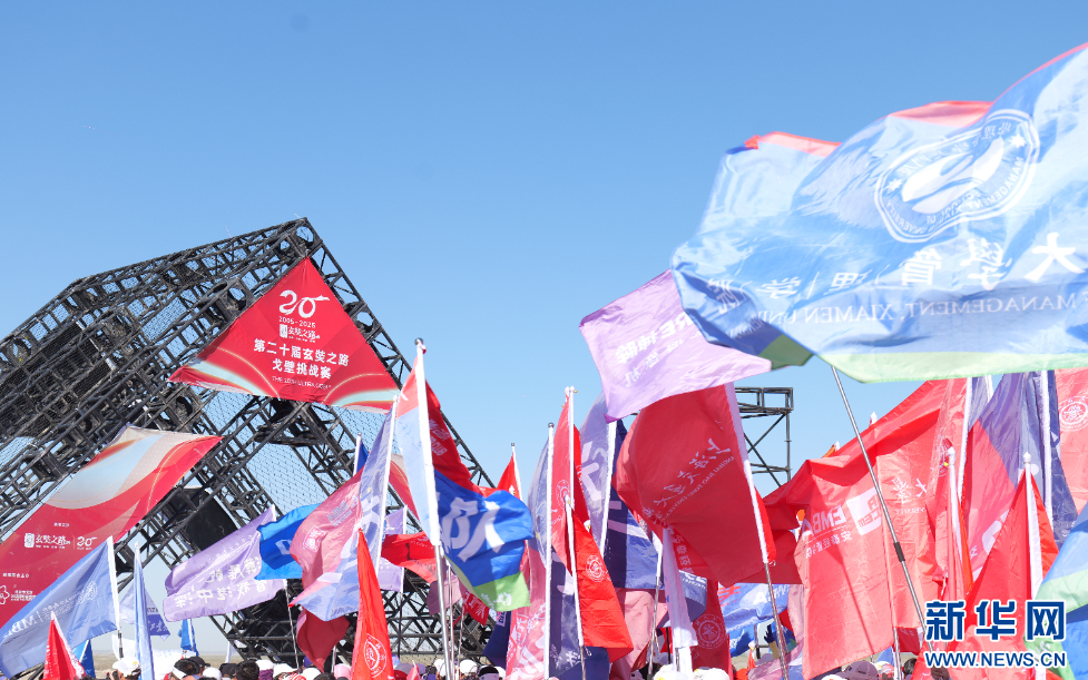 10月1日,第二十届玄奘之路戈壁挑战赛出发仪式现场,各支参赛队伍挥舞各自旗帜。