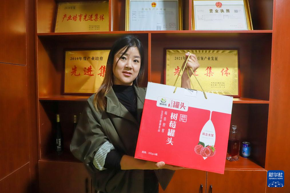 10月6日,工作人员在一家树莓罐头加工厂展示树莓罐头产品。新华社记者 郎兵兵 摄