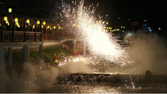 夜幕降临,万象街区灯火辉煌。千年非遗“打铁花”表演如期上演:高温铁水在匠人挥舞中冲向夜空,瞬间化作漫天流星雨般的铁花,游客们仰头欢呼、连连惊叹。