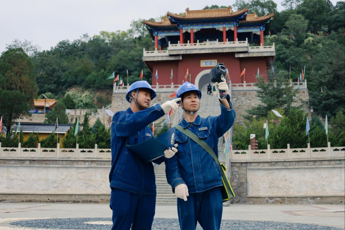 傍晚时分,夕阳为周祖陵镀上一层金辉。游客们开始陆续下山,而保电人员的“夜间巡检模式”才刚刚开启。他们打着手电筒,沿着登山步道一路向上,光柱在黑暗中扫过每一盏路灯、每一个线路接口。“夜间温差大,线路容易出问题。”走到观景台时,小李发现一盏仿古宫灯不亮了,他爬上灯杆检查,原来是线路接触不良。小李立马告诉景区工作人员,并配合工作人员维修。不一会儿,宫灯重新亮起,暖黄的灯光照亮了观景台,也温暖了最后一批驻足赏景的游客。