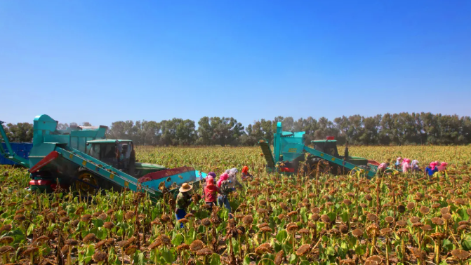 甘肃农垦饮马农场向日葵丰收。完代可