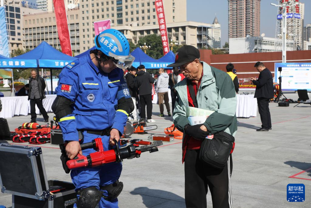 10月13日,在兰州市东方红广场,甘肃蓝天救援队队员为观众介绍救援装备。新华社记者 张智敏 摄