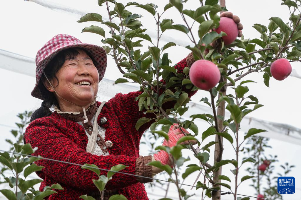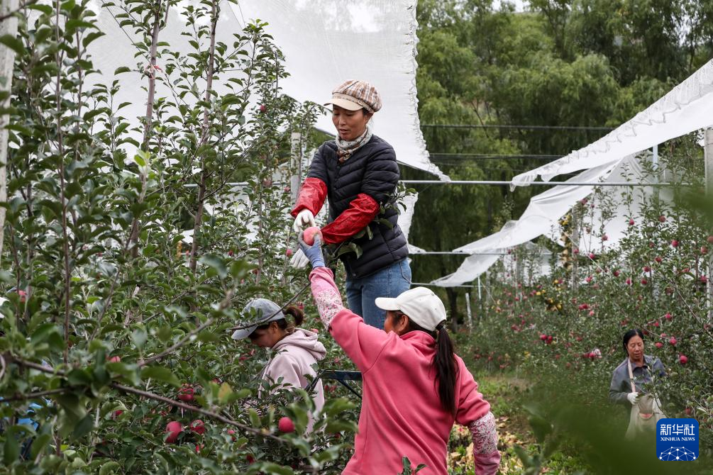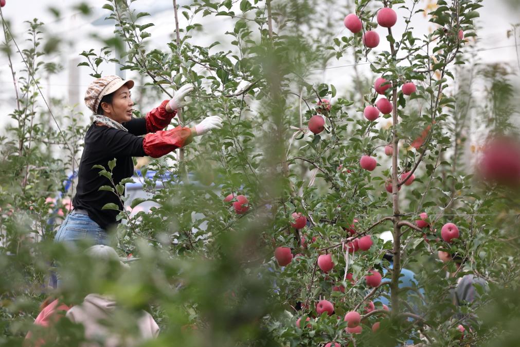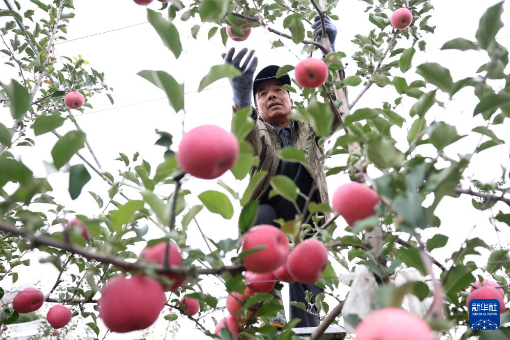 10月14日,在甘肃省陇南市礼县永兴镇何家村一处苹果种植基地,果农采摘苹果。新华社记者 郎兵兵 摄