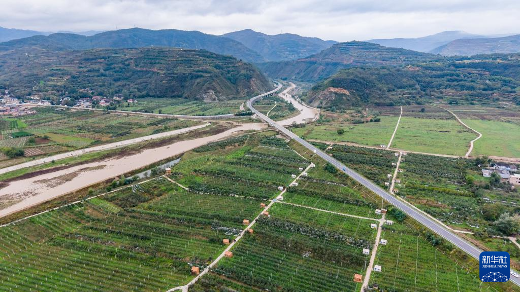 这是10月14日在甘肃省陇南市礼县永兴镇拍摄的一处苹果种植基地,旁边河流为西汉水(无人机照片)。新华社记者 郎兵兵 摄