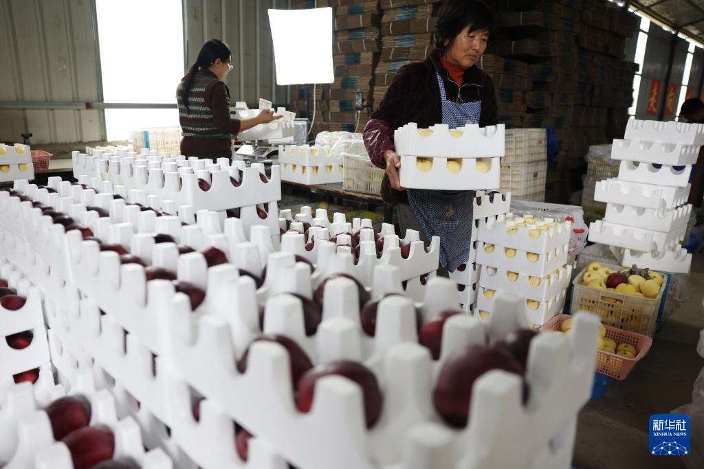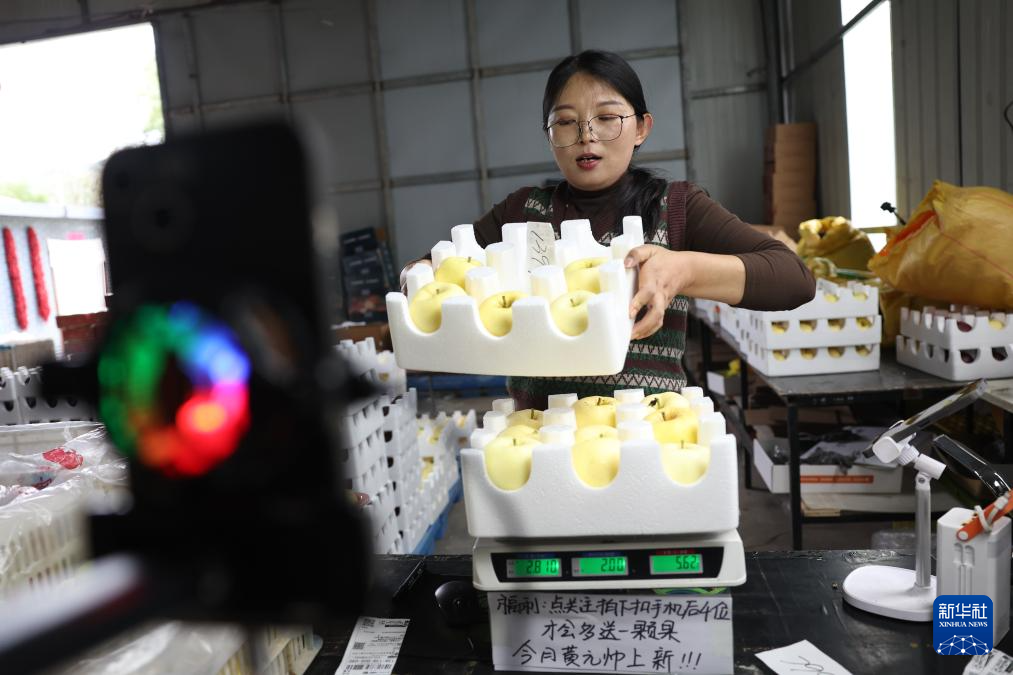 工作人员在礼县一处电商创业基地将直播间销售的苹果打包准备发货(10月14日摄)。新华社记者 陈斌 摄