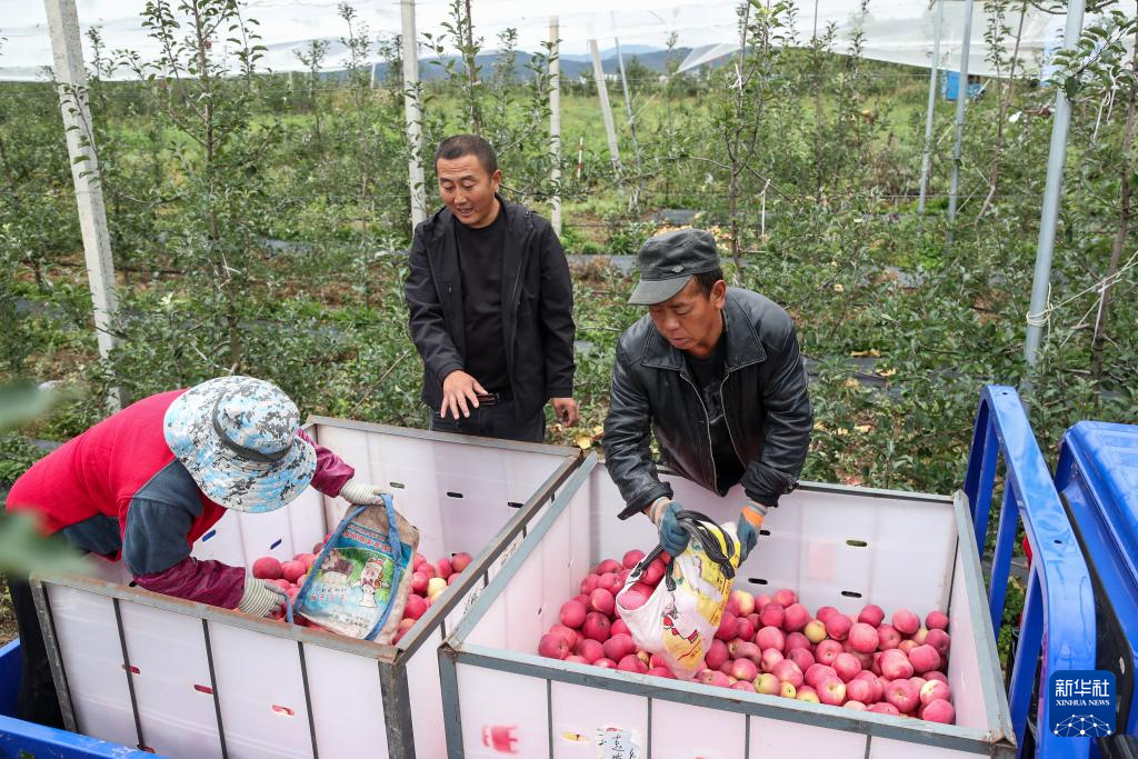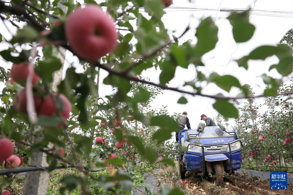 10月14日,在甘肃省陇南市礼县永兴镇何家村一处苹果种植基地,果农将采摘的苹果倒入三轮车内。新华社记者 郎兵兵 摄