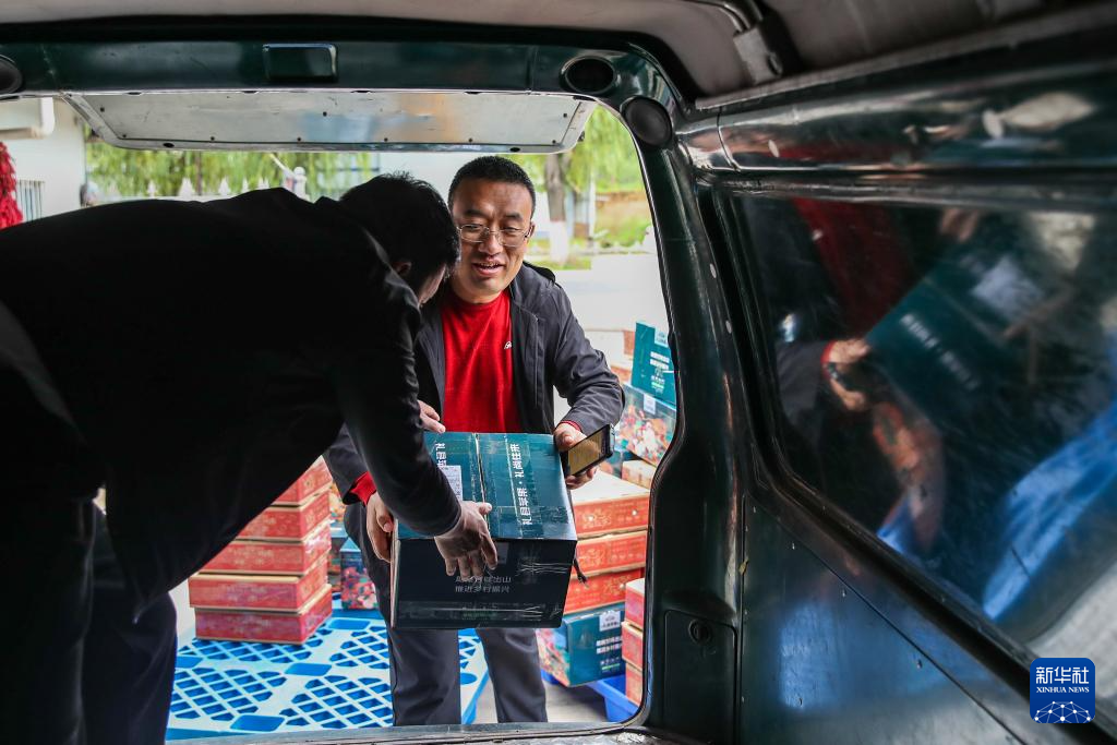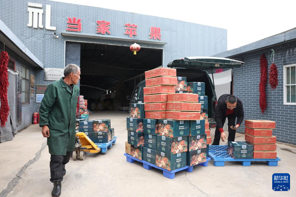 10月14日,在甘肃省陇南市礼县永兴镇一家电子商务有限公司,邮政工作人员将包装好的礼县苹果装车。新华社记者 郎兵兵 摄