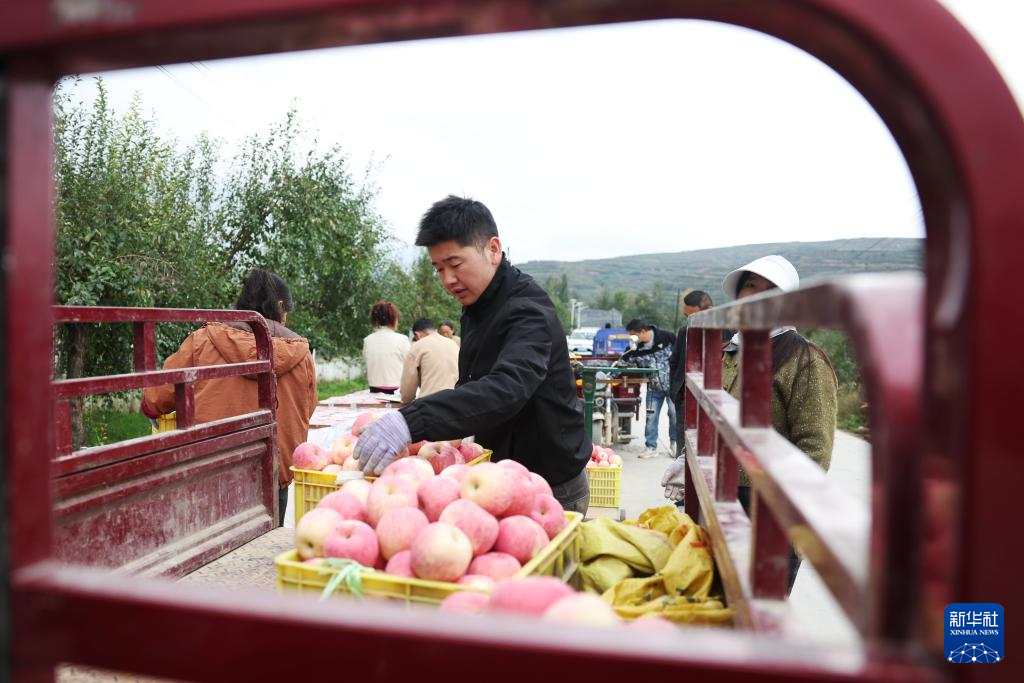 果商在甘肃省陇南市礼县永兴镇何家村一处苹果种植基地外收购苹果(10月14日摄)。新华社记者 陈斌 摄