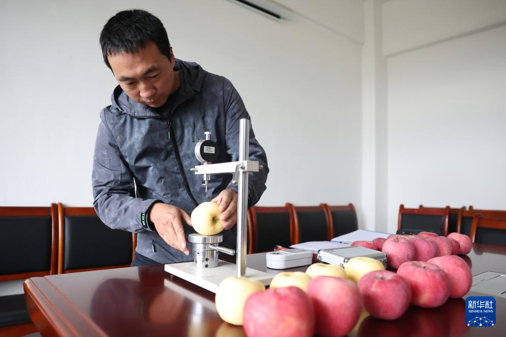 礼县苹果研究所工作人员在检测苹果硬度(10月14日摄)。新华社记者 陈斌 摄