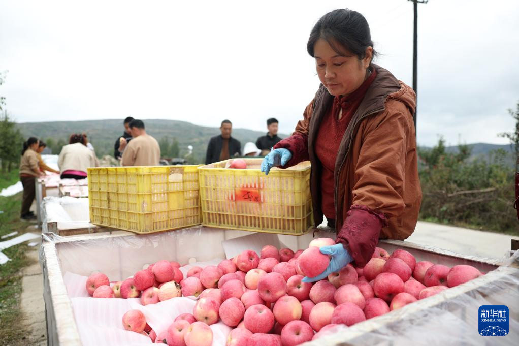 果商在甘肃省陇南市礼县永兴镇何家村一处苹果种植基地收购苹果(10月14日摄)。新华社记者 陈斌 摄