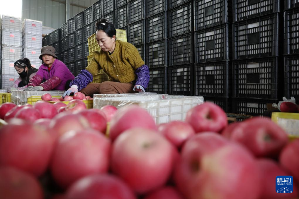 工人在甘肃省陇南市礼县永兴镇一处苹果仓库内分拣苹果(10月14日摄)。新华社记者 陈斌 摄