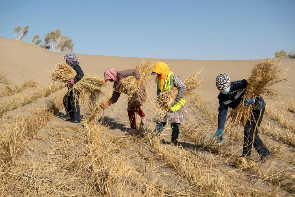10月18日,施工人员在库姆塔格沙漠“锁边工程”项目建设现场铺设沙障。新华社发(高宏善 摄)
