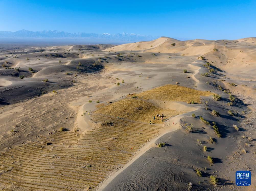 10月18日,施工人员在库姆塔格沙漠“锁边工程”项目建设现场铺设沙障(无人机照片)。新华社发(高宏善 摄)