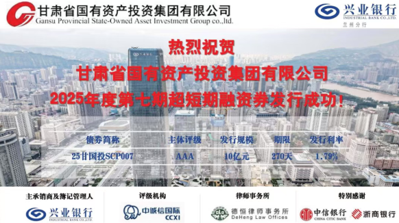 兴启新程,迁创未来!在兴业银行兰州分行乔迁典礼落成之时,分行债券业务再传捷报!兴业银行作为牵头主承销商,助力甘肃省国有资产投资集团有限公司成功发行2025年度第七期超短期融资券,发行金额10亿元,期限270天。