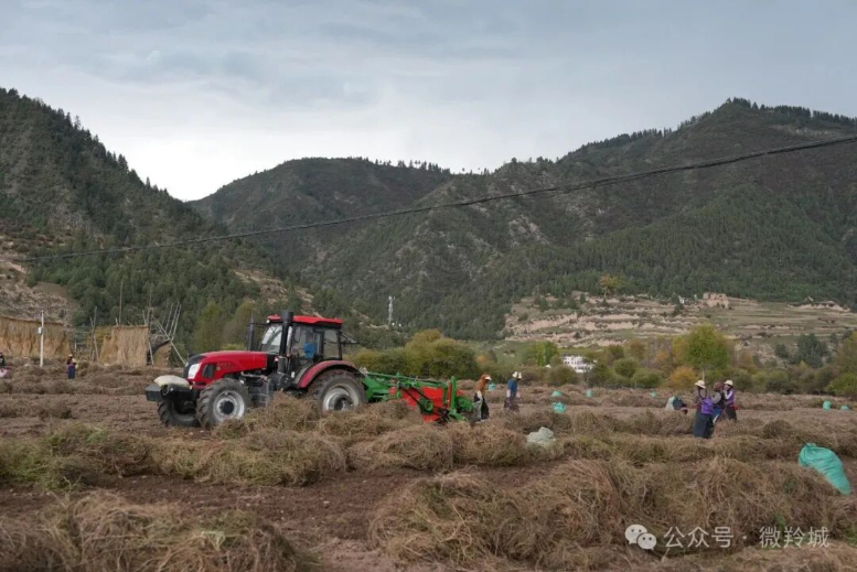在勒秀镇南木杰合作社千亩药材种植基地,2500亩党参、当归、黄芪长势喜人。秋日阳光下,药材收割机穿梭田间,将带泥党参整株挖出,瞬间完成去泥、整理;群众各司其职,或协助装卸药材、或在田边细致采收、或在分拣棚分类筛选,欢声笑语与机械声汇成丰收乐章。