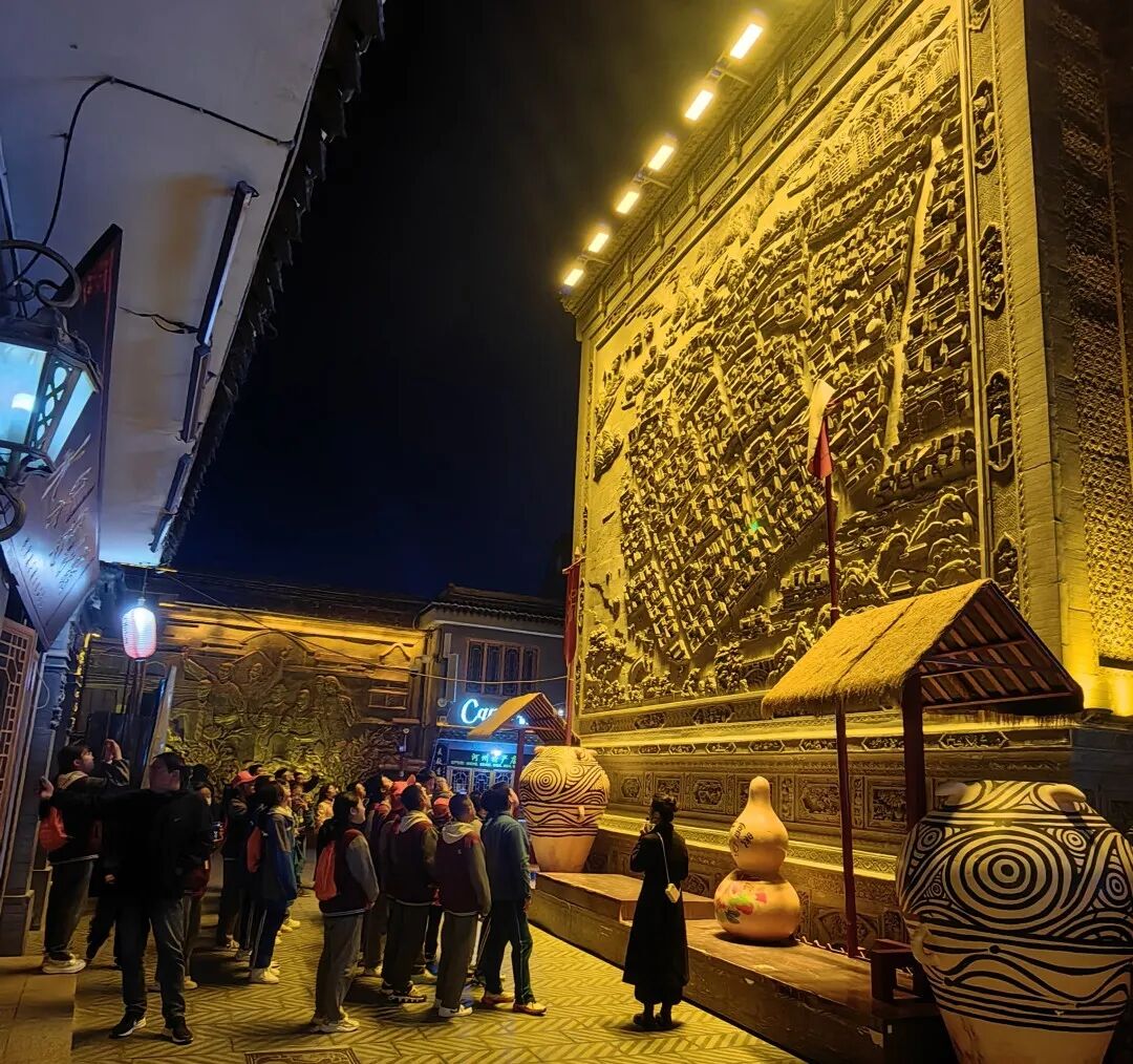 夜幕降临,华灯初上,同学们来到了充满民俗风情的八坊十三巷。青砖黛瓦、雕花门楼在暖黄色灯光的映衬下,仿佛将大家带入了一幅流动的历史画卷。