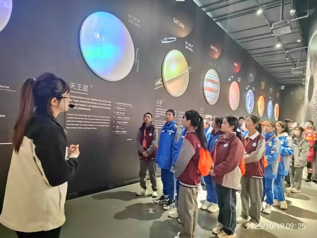 在松鸣研学小镇,同学们参观了工业科创研学中心,通过沉浸式体验C919飞机5D项目,亲身感受大国制造的磅礴力量;在航天科技研学中心尝试“月球漫步”,将探索的视野投向浩瀚星空。在飞跃新生代体验馆,“穿越”到亿万年前,亲身感受古生物时代的壮丽与神奇。