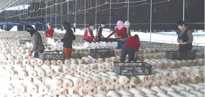 正宁县山河镇董庄村食用菌产业基地,工人在采摘蘑菇。 庆阳融媒记者 刘效国 摄