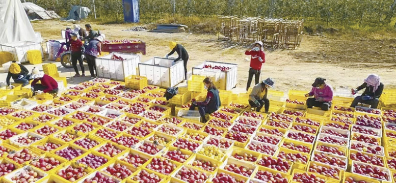 正宁县永和镇下南村互帮合作社苹果示范园里,工人在分拣苹果。 庆阳融媒记者 刘效国 摄