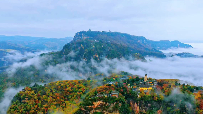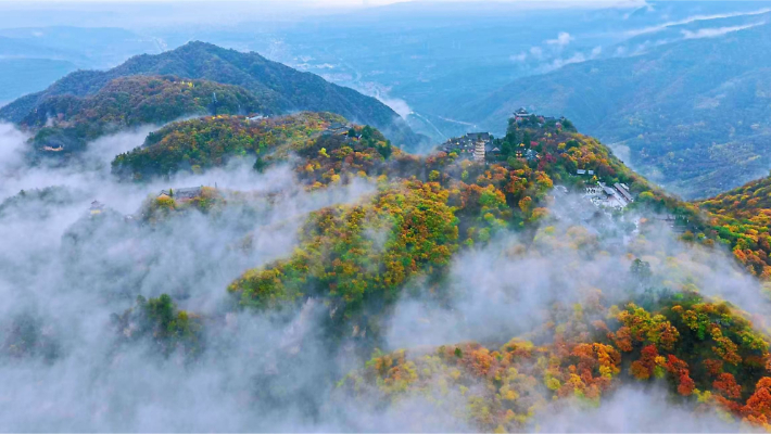 近日,甘肃崆峒山风景区出现壮丽云海景观,与漫山斑斓秋叶、古朴建筑群相互映衬,形成一幅动人的金秋画卷。层层叠叠的秋叶——赭红、金黄与墨绿交织,在云隙中若隐若现。远处亭台楼阁飞檐翘角,在云雾中更显静谧悠远,与主峰香山构成虚实相应的诗意景观。(来源:平凉市委宣传部)