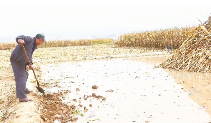 图为农户正在田埂上放水。