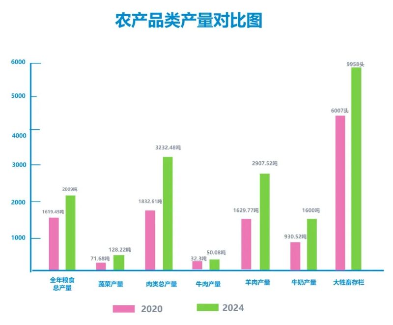 “十四五”以来,阿克塞县农业生产锚定高质量发展目标,保持稳健向好的发展态势。从粮食作物到特色蔬菜,从畜禽肉类到优质奶品,主要农产品产量实现“量质双升”:粮食产能稳步提升,蔬菜供应品类日益丰富,畜禽养殖规模化水平持续提高,奶产品品质不断优化。农业生产供给能力的持续增强,不仅夯实了区域农产品保供基础,更推动农业产业结构逐步优化,整体呈现出“稳中有进、质效齐增”的良好发展局面,为全县农业现代化建设注入了强劲而稳定的动力。