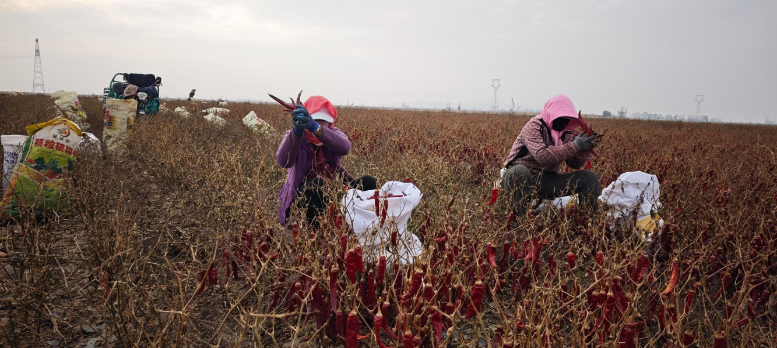 甘肃农垦永昌农场青山分场的千亩辣椒地里工人正在采摘辣椒