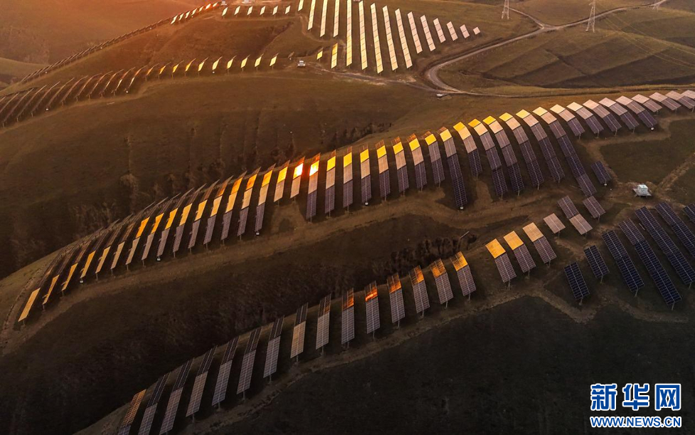 光伏板在夕阳的照耀下泛着金光。新华网发(吴昕龙摄)