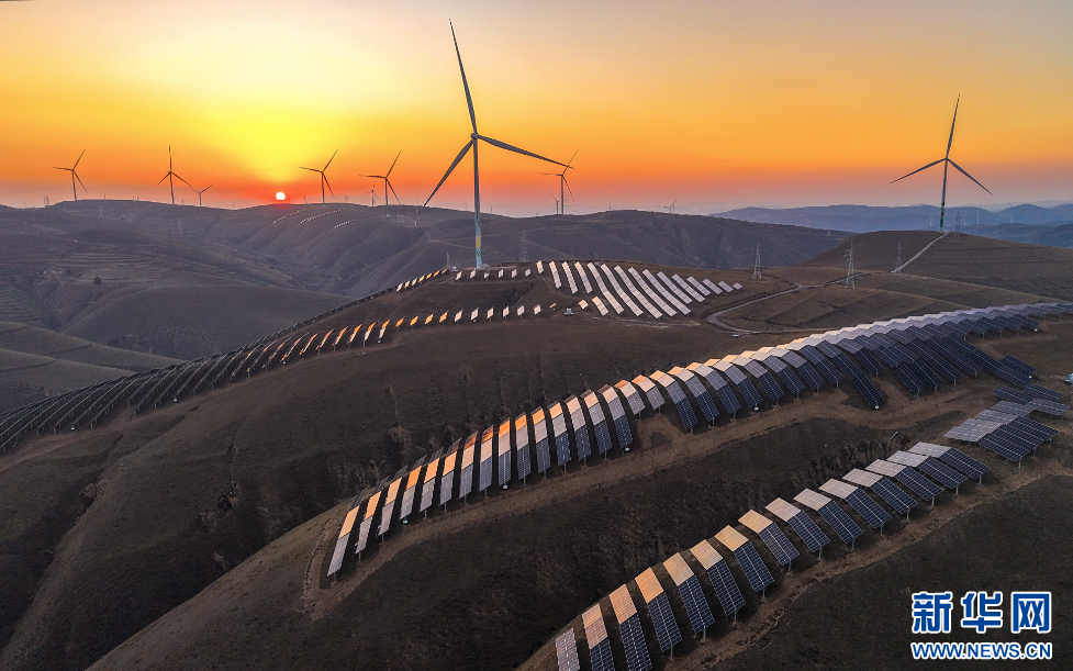 黄土高原上,漫山遍野的光伏发电板和风力发电机组,与晚霞遥相呼应。新华网发(陈坤摄)