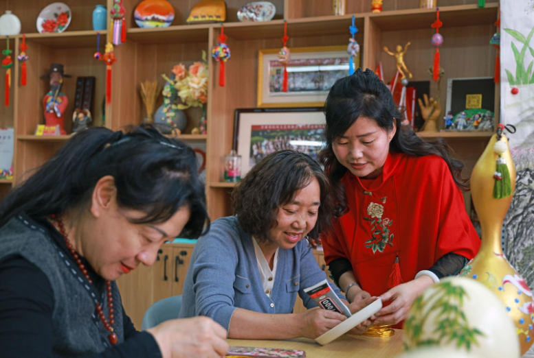 掐丝珐琅艺人李润萍指导居民制作工艺品